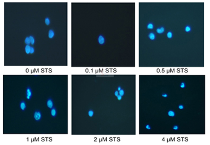 ml接種于六孔闆中;加入終濃度爲0,0.1,0.5,1,2,4 μM STS,37℃ 5%CO2培養3小時;500 g 3 min收集細胞;細胞沉澱中加入1 ml固定液,常溫固定10 min;1×PBS漂洗兩次;細胞沉澱中加入0.5 ml Hoechst 33258染色液,37℃避光(guāng)染色10 min;離(lí)心後細胞沉澱重懸于100 μl 1×PBS中;取5 μl細胞懸液滴于載玻片上,加5 μl 抗熒光(guāng)淬滅劑,封片觀察。