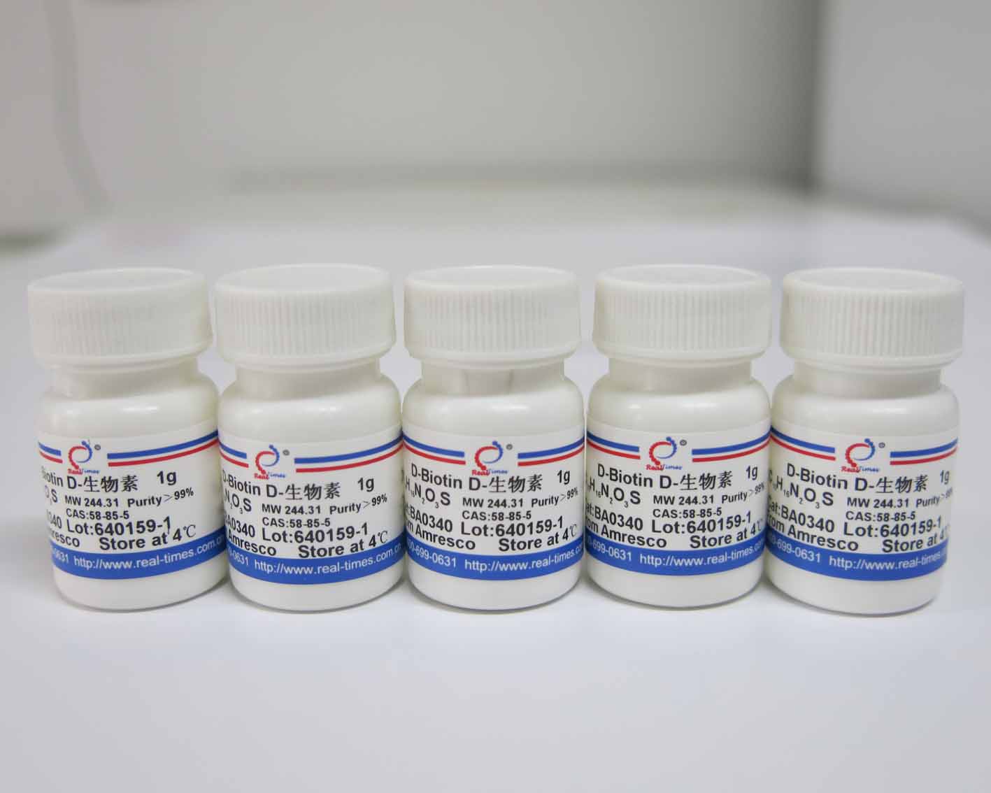 說(shuō)明:A small biomolecule, 244Daltons, that has high binding affinity to avidin and streptavidin often used to label antibodies and enzymes. Several molecules of biotin can react with a single protein molecule to increase the sensitivity at the site of detection in ELISA, immunohistochemistry and Western Blotting.