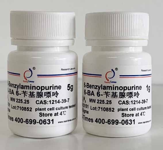 取10 mg 6-BA粉末置于合适容器中,加入2 ml 1 N NaOH溶液至粉末徹底溶解,緩慢(màn)加入雙蒸水,邊加邊混勻,最後用水定容至10 ml。0.22μm水系濾膜抽濾除菌後,适量分(fēn)裝-20℃避光(guāng)保存。