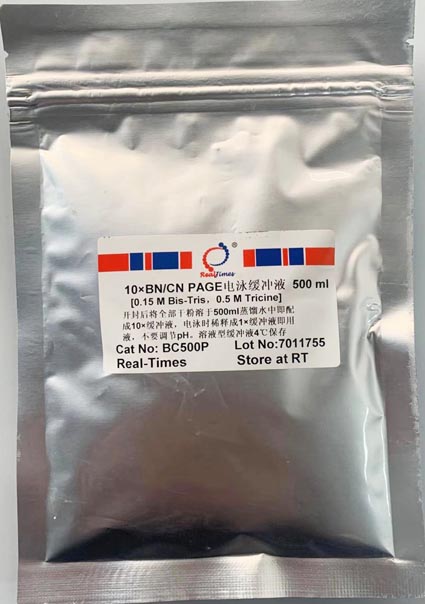 将10×BN/CN PAGE電泳緩沖液(幹粉)溶于500 ml滅菌水中,徹底溶解,測定pH應爲7.0左右,不要調節pH。用前稀釋10倍即配成1×BN/CN PAGE電泳緩沖液。