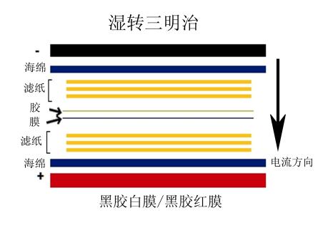 負極(電轉夾黑(hēi)色面)-海綿墊-1層1 mm厚度濾紙-凝膠-膜-1層1 mm厚度濾紙-海綿墊-正