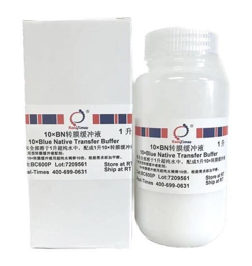 10×BN轉膜緩沖液(10×Blue Native Transfer Buffer)适用于BN蛋白(bái)電泳後凝膠上非變性蛋白(bái)的轉膜。本轉膜液配制便捷,稀釋後無需調節pH值,pH約爲7.5-7.7。該緩沖液最終可(kě)配成10升即用型1×緩沖液(根據需求補加甲醇)。