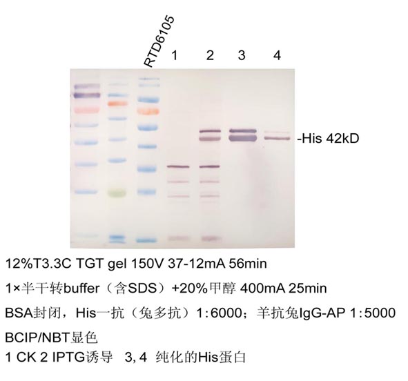 1.2 将印迹膜完全浸入到适量BCIP/NBT 顯色液中,常溫避光(guāng)孵育 10-20 分(fēn)鍾,至膜上條帶清晰可(kě)見(jiàn)。顯色完畢後,将膜浸入水中,終止反應。