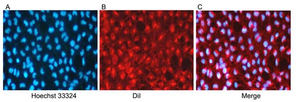 ml PBS,觀察拍(pāi)照(zhào)(40×)(圖A);去(qù)除PBS,DiI染色,37度10分(fēn)鍾,去(qù)除DiI染色液,加1.5ml PBS,觀察拍(pāi)照(zhào)(40×)(圖B)
