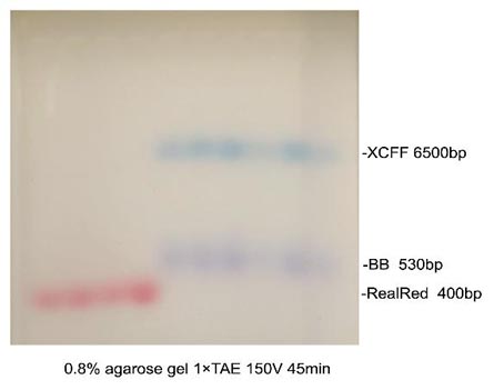 6×RealRed DNA上樣緩沖液(6×RealRed DNA loading buffer)是一種經過改良的六倍濃縮的DNA上樣緩沖液。常規的以溴酚藍爲指示劑的DNA緩沖液,由于溴酚藍的電泳的位置與200-500 bp的DNA的電泳位置相(xiàng)近,在EB染色觀察200-500bpDNA時,溴酚藍對這些DNA片段的觀察有很強的幹擾。特别是當這些小片段的量較少時,溴酚藍甚至會把小片段DNA的信号全部遮蓋掉。而該上樣緩沖液紅(hóng)色指示前沿的電泳位置相(xiàng)當于100-200 bp的DNA片段。這樣就(jiù)可(kě)以基本消除染料對小片段DNA觀察時的幹擾。另外,6×RealRed