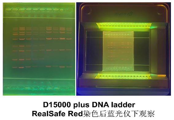 将RealSafe Red試劑按1:10000溶于瓊脂糖凝膠溶液中,充分(fēn)混勻。(例如(rú):将5 μl RealSafe Red 試劑加入到50 ml 凝膠溶液中)。注:由于RealSafe Red 具有出色的熱(rè)穩定性,可(kě)将試劑直接加入高溫的凝膠溶液中,而不用等凝膠溶液冷(lěng)卻後再加入。