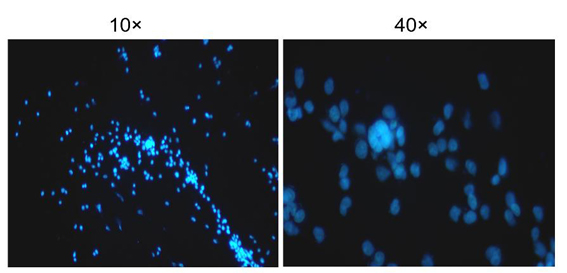 1.2.6 熒光(guāng)顯微鏡下紫外激發,可(kě)檢測到呈藍色的細胞核。激發波長350 nm左右,發射波長460 nm左右。