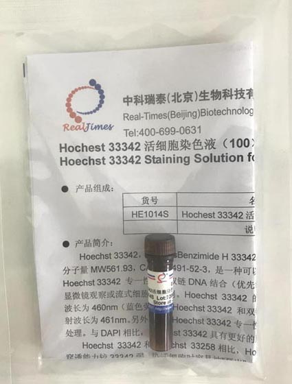 本染色液爲100×濃度,使用終濃度爲1×,可(kě)直接用于活細胞或組織的細胞核染色,也可(kě)稀釋後用于固定細胞或組織的細胞核染色。