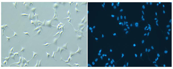 293細胞消化後調整密度爲1×105/ml;12孔闆,每孔接種1 ml,37度培養30小時;加入10 μl Hochest 33342活細胞染色液(100×);37度培養10分(fēn)鍾,直接觀察。