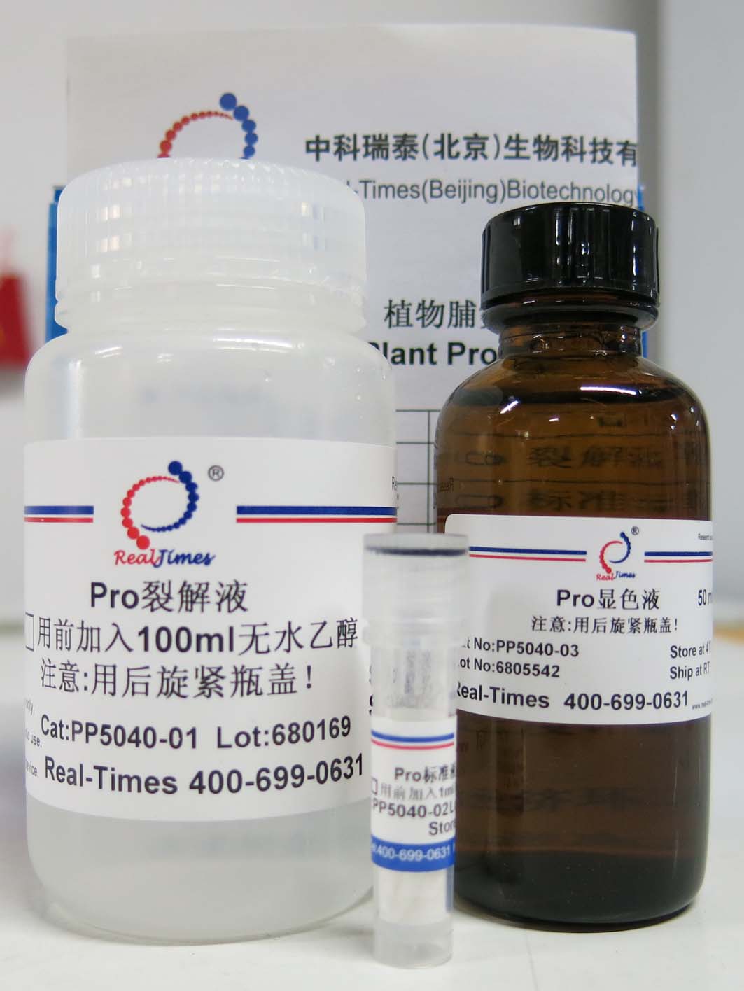 脯氨酸(Proline,Pro)是一種環狀的α-亞氨基酸,呈中性,等電點爲6.30,易溶于水。在正常環境情況下脯氨酸含量較低,但(dàn)在逆境下(旱、熱(rè)、冷(lěng)、凍、鹽堿等),脯氨酸常有明顯積累,即積累指數與植物的抗逆性有關。植物脯氨酸檢測試劑盒(茚三酮比色法)檢測原理(lǐ)是脯氨酸與茚三酮共熱(rè)發生(shēng)反應,能産生(shēng)穩定的紅(hóng)色産物,以分(fēn)光(guāng)光(guāng)度計(jì)測定處吸光(guāng)度,在一定範圍内顔色深淺(即吸光(guāng)度)與脯氨酸濃度成正比。