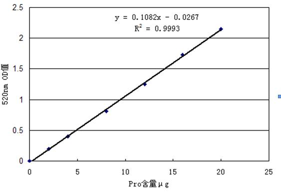 以系列脯氨酸标準(1-8号管)含量(μg)爲橫坐(zuò)标,以對應的吸光(guāng)度爲縱坐(zuò)标,制作(zuò)标準曲線,根據測定管的吸光(guāng)度進而計(jì)算其脯氨酸含量。