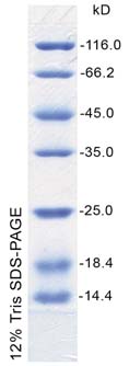 本産品包含7種已知分(fēn)子量的标準蛋白(bái)質組成,分(fēn)子量範圍爲14.4kD-116kD,可(kě)以用來(lái)判斷 SDS-PAGE未知蛋白(bái)的分(fēn)子量。本成品由于含有SDS,不适于非變性膠蛋白(bái)電泳(Native