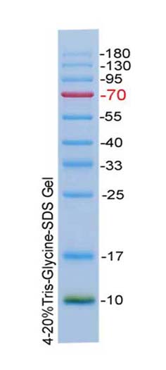 本産品包含10種純化的預染蛋白(bái)質組成,分(fēn)子量範圍爲10-180kD,其中70kD條帶爲紅(hóng)色,10kD條帶爲綠色,其餘條帶爲藍色,可(kě)以用于SDS-PAGEWestern Blot轉膜時确定未知蛋白(bái)的分(fēn)子量。