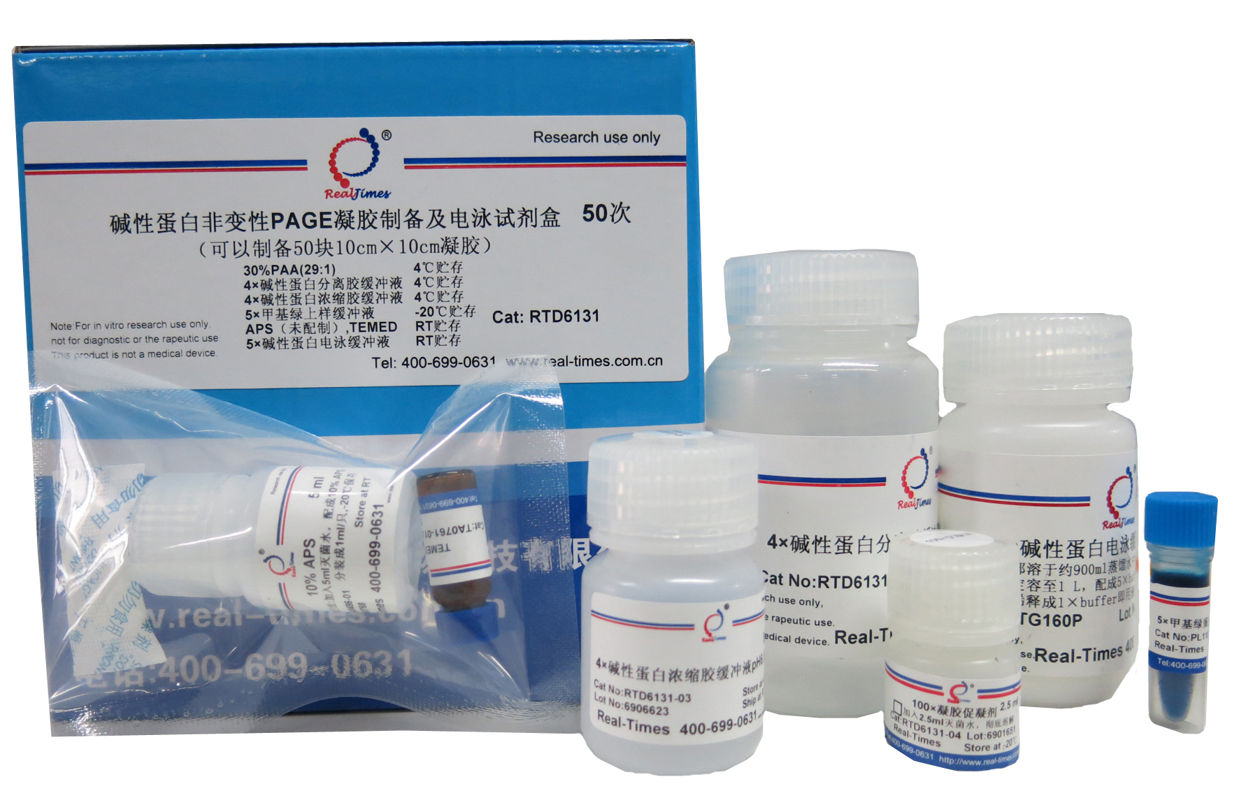 本公司提供的試劑盒包含堿性蛋白(bái)凝膠制備及電泳所需的全部試劑,用戶隻需自(zì)備制膠器具和蒸餾水。本試劑盒可(kě)用于配制堿性蛋白(bái)非變性(native)PAGE凝膠。本試劑盒可(kě)配制30-50塊常規大(dà)小的非變性PAGE膠。