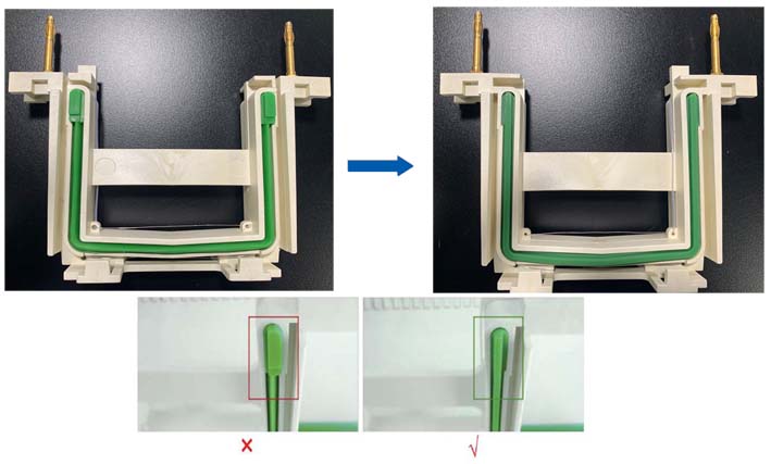 注:伯樂Mini III或Mini-PROTEAN Tetra Cell,天能VE-180,六一24K系列電泳槽請(qǐng)确保密封條的安裝方向(下圖)。