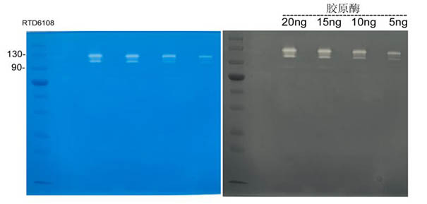 實驗結果:膠原酶消化明膠底物,在70-130 kD區間産生(shēng)明亮條帶。