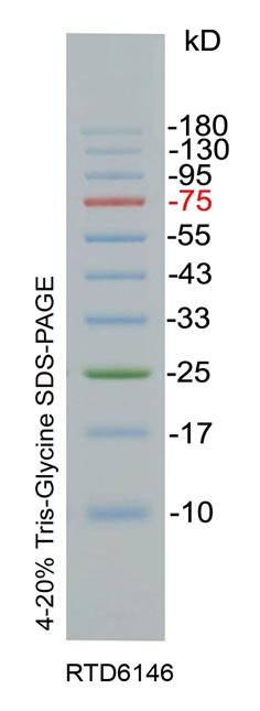 本産品包含10種純化的預染蛋白(bái)質組成,分(fēn)子量範圍爲10-180 kD,其中75 kD條帶爲紅(hóng)色,25 kD條帶爲綠色,其餘條帶爲藍色,可(kě)以用于SDS-PAGEWestern Blot轉膜時确定未知蛋白(bái)的分(fēn)子量。