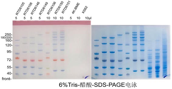 該試劑盒包含凝膠制備、蛋白(bái)上樣、蛋白(bái)電泳、蛋白(bái)染色及轉膜所需的全部試劑。試劑盒配套的制膠溶液,可(kě)以配制10闆厚度1mm凝膠(面積8×10 cm),分(fēn)離(lí)膠濃度爲6%,可(kě)以有效分(fēn)離(lí)50-500 kD範圍内蛋白(bái)。配好的凝膠濃縮膠爲紅(hóng)色,方便上樣。本試劑盒用于蛋白(bái)變性還(hái)原電泳,不适用于蛋白(bái)非變性電泳。