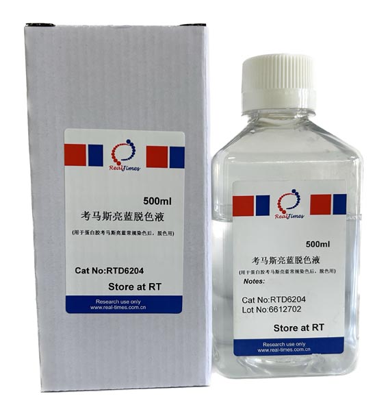 Blue Staining Destaining Solution)是用于蛋白(bái)凝膠考馬斯亮藍染色後凝膠的脫色。本脫色液可(kě)以和考馬斯亮藍染色液(RTD6203)配套使用。使用本脫色液進行脫色,采用常規脫色方法至少脫色1小時可(kě)以觀察到蛋白(bái)條帶;采用快(kuài)速脫色方法不足20分(fēn)鍾即可(kě)觀察到蛋白(bái)條帶。觀察到最清晰的蛋白(bái)條帶則需脫色更長時間。