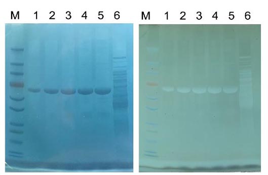 本試劑采用以銅離(lí)子爲基礎的負染色方法,用于SDS-PAGE或Native-PAGE電泳凝膠染色,不需要使用含有刺激性的甲醛和冰醋酸,實驗方便快(kuài)速,可(kě)以在30 min左右完成,最低能夠檢測出2 ng的蛋白(bái)條帶,該方法不對蛋白(bái)質産生(shēng)修飾作(zuò)用,而且經過脫色液處理(lǐ)後,可(kě)以用于電洗脫或采用PAGE膠蛋白(bái)微量回收試劑盒(貨号:RTD8108)進行膠回收,以便進行質譜和測序分(fēn)析等,也可(kě)以用于電轉移或用其他(tā)染色方法(銀染或考染)對膠重新染色。