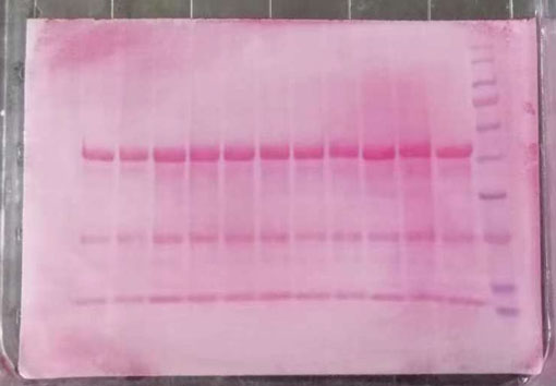 2. 将膜浸泡到适量麗春紅(hóng)染色液中,搖動5-15分(fēn)鍾。此時膜背景爲紅(hóng)色,條帶不可(kě)見(jiàn)或不明顯。
