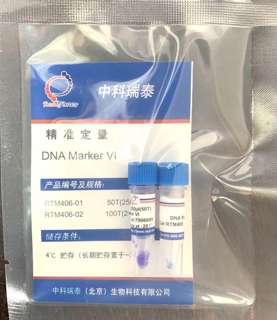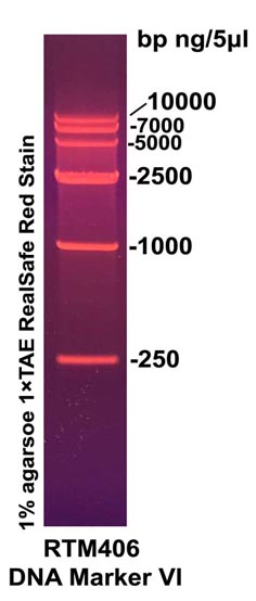 本産品是由6條帶狀雙鏈DNA條帶組成,适用于瓊脂糖凝膠電泳中DNA條帶的分(fēn)析。産品中已含有1×loading buffer,可(kě)根據實驗需要,直接取2-5μl電泳,使用方便,電泳圖像清晰。6條帶的大(dà)小分(fēn)别爲250100025005000700010000bp。其中2500bp條帶含量爲100ng/5μl,顯示加亮帶,其餘條帶濃度爲50ng/5μl