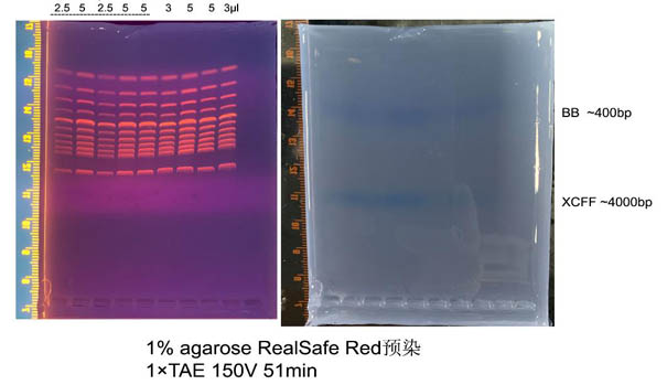 4. 推薦使用RealSafe系列染料(貨号:GR002,GR003,GR004)染色。如(rú)果使用Goldview或EB等染料進行染色,由于此類染料帶更多的正電荷(染料移動方向與核酸泳動方向相(xiàng)反),随着電泳時間延長,染料向大(dà)片段聚集,凝膠會出現陰陽膠現象(染料含量高的凝膠紫外下較亮,含量低的凝膠紫外下發暗),導緻小分(fēn)子量DNA顯色很弱或不可(kě)見(jiàn)。陰陽膠可(kě)以在電泳結束後浸泡染色,将膠浸沒在含1 μg /ml EB或Goldview的電泳緩沖液中20-25 min,小分(fēn)子量DNA會顯色清楚。更長時間浸泡會因DNA分(fēn)子擴散而使條帶彌散,小分(fēn)子量DNA更易彌散。