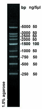 本産品是由9條帶狀雙鏈DNA組成,适用于瓊脂糖凝膠電泳中DNA條帶的分(fēn)析。本産品爲即用型産品,已含有1×loading buffer,可(kě)根據實驗需要,直接取2-5μl電泳,使用方便,電泳圖像清晰。 本産品中9條帶爲250500750100015002000250030005000bp,其中1500bp條帶爲100ng/5μl,其餘條帶濃度爲50ng/5μl