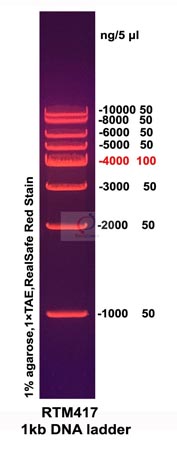 本産品爲即用型産品,已含有1×loading buffer,可(kě)根據實驗需要,直接取2-5μl電泳,使用方便,電泳圖像清晰。本産品中8條帶分(fēn)爲1000(50 ng/5 μl),2000(50 ng/5 μl),3000(50 ng/5 μl),4000(100 ng/5 μl),5000(50 ng/5 μl),6000(50 ng/5 μl),8000(50 ng/5 μl),10000bp(50 ng/5 μl)。其中4000bp條帶加亮顯示。