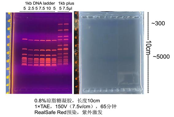 2. 建議(yì)電泳條件(jiàn):凝膠濃度爲0.8-1.0%,凝膠長度10 cm,電泳電壓~7v/cm,電泳時間60+分(fēn)鍾。
