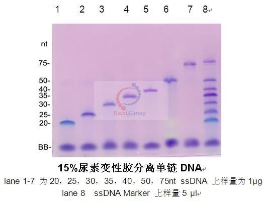 單鏈DNA Marker由不同長度的單鏈DNA分(fēn)子混合而成,7條帶的大(dà)小爲20,25,30,35,40,
