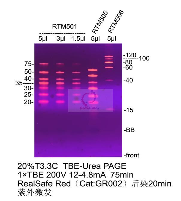 PAGE電泳染色試劑盒(Cat:RTS5103),核酸PAGE電泳染色試劑盒(Cat:RTS5102),核酸快(kuài)速高靈敏度染色試劑盒(Cat:RTS5101)或RealSafe類核酸染料染色均可(kě)以得(de)到清晰的條帶分(fēn)離(lí)效果。