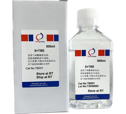 TBE 即 Tris-Borate-EDTA buffer ,5×TBE是 5 倍濃縮的 TBE,使用時需用蒸餾水稀釋 5 倍後再使用,1×TBE工(gōng)作(zuò)液中組份濃度:89 mM Tris-borate,2 mM EDTA,pH8.0。