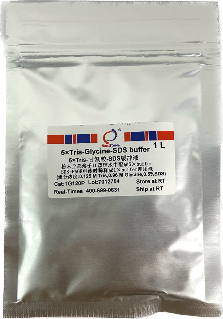 TG120P全部粉末溶于1 L超純水中,即配制成1 L 5×Tris-甘氨酸-SDS電泳緩沖液