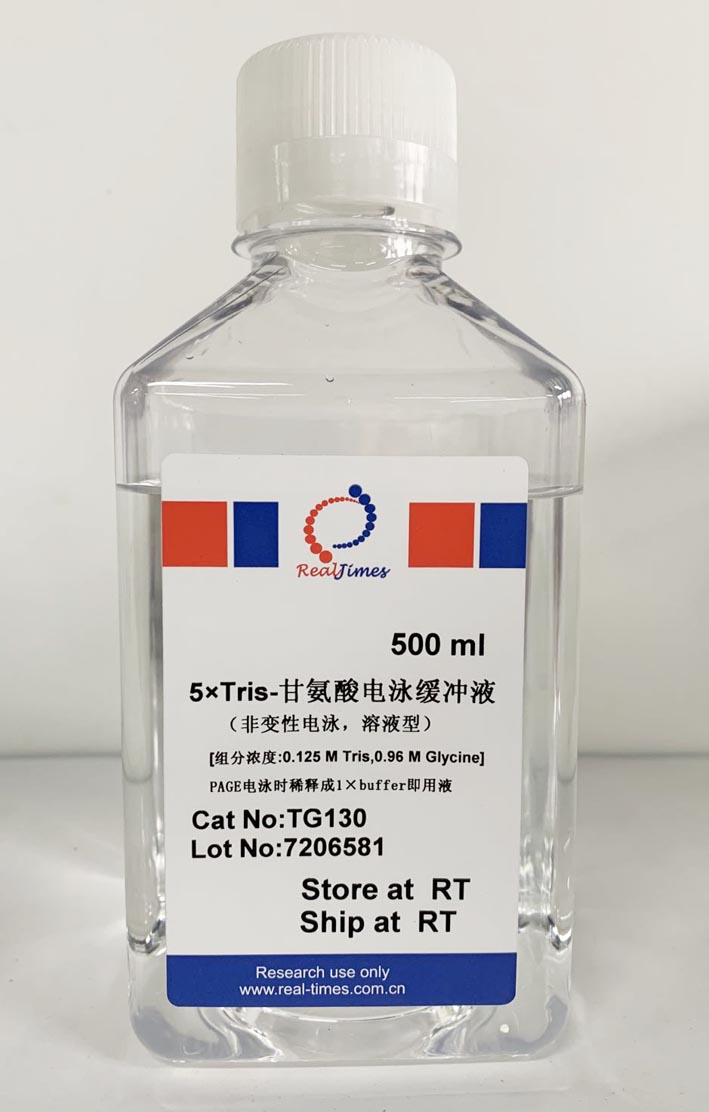 5×Tris-甘氨酸電泳緩沖液是可(kě)以用于非變性PAGENative-PAGE)的電泳緩沖液。本溶液爲5×濃縮液,使用前稀釋成1×即用型緩沖液使用。1×即用型Tris-甘氨酸電泳緩沖液組份濃度爲:192 mM 甘氨酸, 25 mM Tris