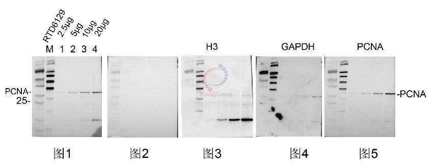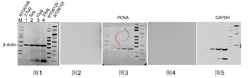 圖1:一抗:PCNA鼠單抗 1:5000,RT 60min;二抗:羊抗鼠IgG-HRP 1:5000 RT 60min,ECL曝光(guāng)1秒