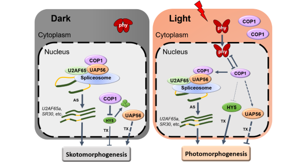 太陽光(guāng)不僅是植物光(guāng)合作(zuò)用的能量來(lái)源,也是一種重要的環境信号,調節植物的生(shēng)長發育進程。其中幼苗光(guāng)形态建成受光(guāng)質、光(guāng)量的精确調控,涉及不同的光(guāng)受體(tǐ)和一系列信号調控因子。COP1是光(guāng)形态建成的一個明星蛋白(bái),它作(zuò)爲一種E3泛素連接酶,與目标蛋白(bái)互作(zuò)并促進其降解,COP1在植物和動物中廣泛存在。真核生(shēng)物的基因大(dà)多含有内含子,轉錄形成前體(tǐ)mRNA,通過動态剪接組裝,形成成熟的mRNA。可(kě)變剪接也稱選擇性剪接,是一種非常重要的基因轉錄後調控機(jī)制,在特定位點發生(shēng)剪接從(cóng)而生(shēng)成多種mRNA,翻譯成不同蛋白(bái)質,在相(xiàng)應的發育時期發揮重要功能。近年(nián)來(lái),有研究通過轉錄組分(fēn)析了光(guāng)照(zhào)對于可(kě)變剪接的調控現象,但(dàn)對其中的具體(tǐ)調控機(jī)制并不清楚。