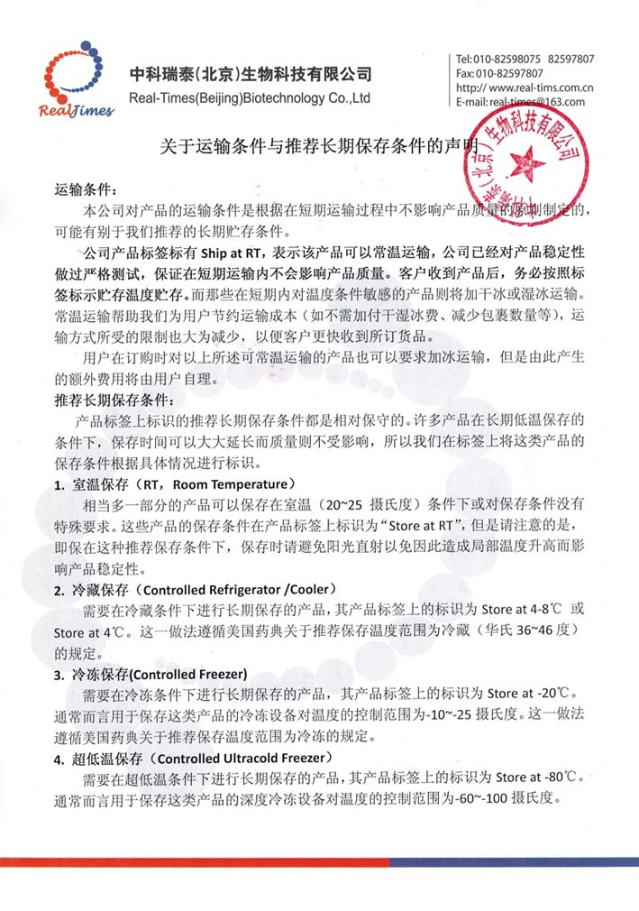 關于運輸條件(jiàn)與推薦長期保存條件(jiàn)的聲明