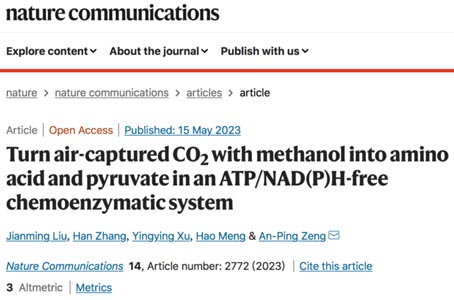 Liu, J., Zhang, H., Xu, Y. et al. Turn air-captured CO2 with methanol into amino acid and pyruvate in an ATP/NAD(P)H-free chemoenzymatic system. Nat Commun 14, 2772 (2023).DOI:10.1038/s41467-023-38490-w