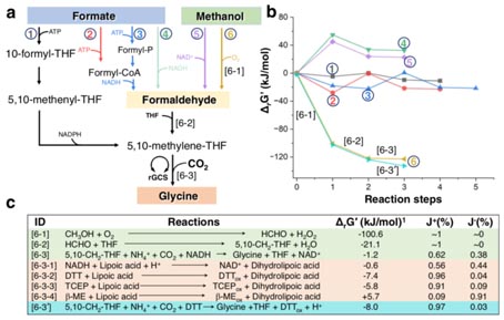 要點1. 它依賴于一個重新設計(jì)的甘氨酸裂解系統,用二硫蘇糖醇對H蛋白(bái)進行生(shēng)物相(xiàng)容的化學還(hái)原來(lái)取代依賴NAD(P)H的L蛋白(bái)。後者提供了更高的熱(rè)力學驅動力,決定了反應方向,避免了限速酶羧基酶的蛋白(bái)質聚合。
