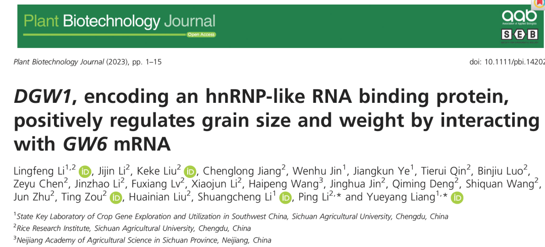 10月20日(rì),植物學知名期刊Plant Biotechnology Journal在線發表了四川農業大(dà)學梁越洋/李平團隊題爲“DGW1, encoding an hnRNP-like RNA binding protein, positively regulates grain size and weight by interacting with GW6mRNA”的研究論文,揭示了hnRNP類RNA結合蛋白(bái)DGW1,靶向結合水稻粒型調節因子GW6mRNA調控水稻籽粒大(dà)小的分(fēn)子機(jī)制,爲水稻粒型改良提供了新的思路(lù)。