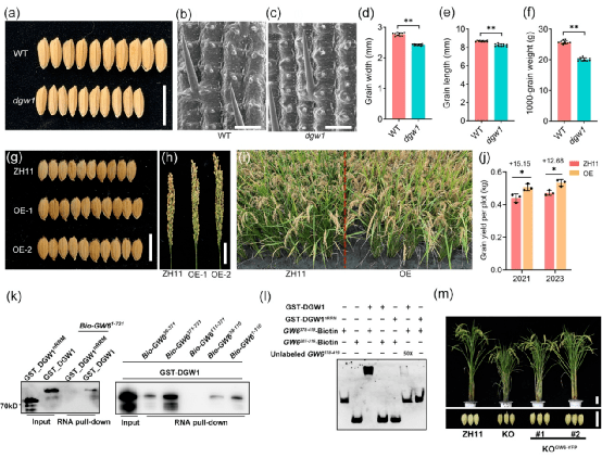 Plant Biotechnology Journal[2022 IF13.8] 四川農業大(dà)學梁越洋/李平團隊揭示hnRNP類RNA結合蛋白(bái)DGW1調控水稻籽粒大(dà)小的分(fēn)子機(jī)制