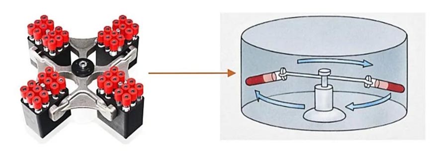 水平轉子又稱甩平轉子、蕩平轉子,轉頭靜(jìng)止時,處于轉頭中的離(lí)心管中心線與旋轉軸平行,轉頭旋轉加速時,離(lí)心管中心線由平行位置逐漸過渡到垂直位置,即與旋轉軸成90?角。此種轉子主要用于樣品做密度梯度離(lí)心,顆粒移動距離(lí)長,相(xiàng)應離(lí)心時間一般也較長,溶液中的組分(fēn)相(xiàng)對于管壁的位置在離(lí)心過程中和離(lí)心後不發生(shēng)改變,因此離(lí)心效果好,能夠分(fēn)離(lí)密度差小的樣品。